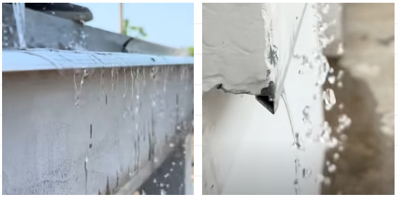 滴水线的常见形式有两种:一种是鹰嘴状,外边凸出来,里边是斜坡,呈垂直向下的状态;另一种是凹槽状,形成一个分割线,雨水到这里就会垂直往下滴落,不会继续往墙里渗透。